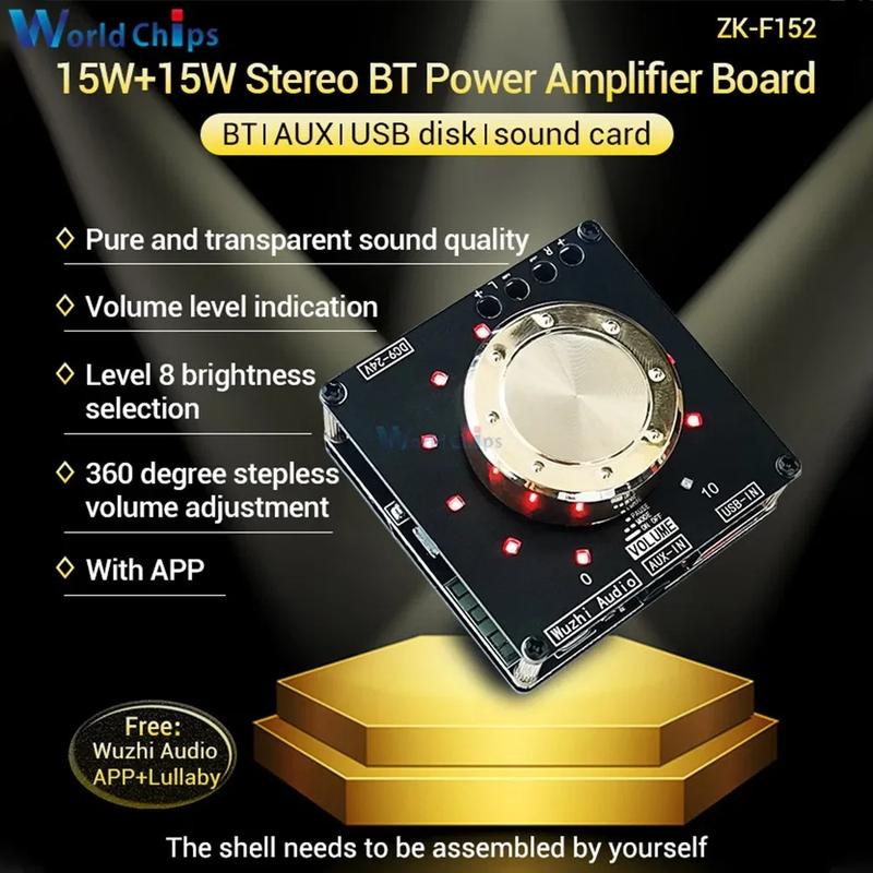 1.ZK-F152 модель с индикацией уровня громкости и возможностью управления через приложение с телефона. Многофункциональная ручка управления( и вкл, выкл, и регулировка громкости и переключение режимов воспроизведения.) Bluetooth 5,1 15 Вт + 15 Вт. беспроводной аудио усилитель мощности Цифровой усилитель 3,5 мм AUX USB APP цифровой усилитель мощности, стерео . Плата усилителя с регулятором. Питание:DC12V- 24V . 3,5 мм AUX вход , USB для чтения с флешки. Приложение Wuzhi Audio. Динамики 4-8 ом можно использовать( при 4 ом питание оптимально использовать 12-14 вольт, при 8-ми омных до 24 вольт)