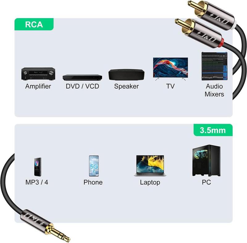 Ідеальне підключення: підключення смартфонів (Galaxy тощо), MP3-плеєрів, планшетів до стереоприймача, динаміків, підсилювачів та інших пристроїв із підтримкою RCA. Excellet Sound: подвійне екранування, стійкі до корозії позолочені з'єднувачі, завдяки чому звуковий сигнал передається з мінімальними втратами сигналу. Двонаправлений: аудіовходом може бути 2 RCA або 3,5 мм. Іншими словами, обидва вони працюють від 2RCA до 3,5 мм і від 3,5 мм до 2RCA.