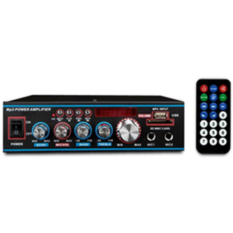Стереофонічний підсилювач Вбудований FM тюнер, USB МР3 плеєр Входи-2mono+1stereo Потужність: 2*30W (4Ω) Частотний діапазон: 20Hz-20KHz Еквалайзер: 2-х смугий Ефект:DIGITAL Effector Пульт дистанційного керування Напруга живлення-220V