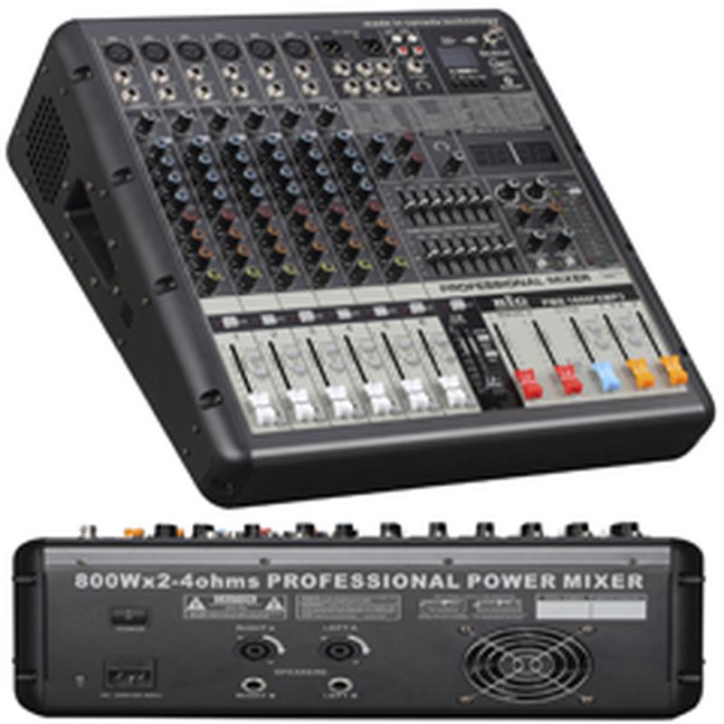 Силовий мікшерський пульт (мікшер із вбудованим підсилювачем) ВИРОБНИЦТВО КАНАДУ Найновіша розробка відповідно до найжорсткіших вимог до якості Підсилювач- Удосконалений класичний підсилювач із використанням SMD технологій АВ клас, тороїдальний блок живлення, бі полярні транзистори Потужність - 2*800Вт(4ом) 2*400Вт(8ом) Частота відтворення – 20гц-20кгц Примусове охолодження з повним набором захисту Вихідні роз\'єми-Спікон-Джек Мікшерський пульт- 6 моно універсальних каналів з використанням ДЖЕК-line КАНОН-mic 1 стерео канал із використанням 2-RCA Регулятор чутливості для кожного каналу Чотирьох смуговий темброблок для моно каналів Двосмуговий темброблок для стерео каналу 2*7ми смугий еквалайзер на кожен вихід Подвійний відбір на внутрішні ефект процесори Регулювання балансу для кожного каналу Відбір на монітори та суб групу Повзунковий регулятор гучності кожного каналу Подвійний ефект процесор Вбудовані подвійні 24біт 48кгц голосові ефект процесори Використовує покращені 2*99 DSP програм Hall/Chorus/Room/Delay/Rotary speaker/Plate/Flange/Vocal Регулятор параметрів для кожного ефекту Два повзункові регулятори рівня гучності для кожного з процесорів ефектів Вбудований MP3-USB -Блютуз плеєр з великим екраном та функцією запису Повзунковий регулятор гучності рівня MP3 Фантомне живлення для конденсаторних мікрофонів +48В 12-ти смугий лід індикатор вихідного рівня сигналу Підключення навушників з можливістю регулювання гучності та вибору каналу Повзункові майстер регулятори рівня загальної гучності лівий+правий
