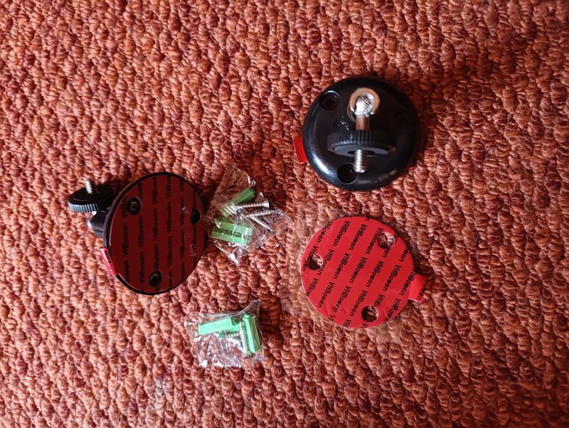 универсальный кронштейн для камеры крепится как на липучке так и на шурупах, поворачивается на 360 градусов. цена за одну шт. 300 гр. есть две шт и одна запасная клеящаяся прокладка. цена за комплект тот что на фото 600 гр.