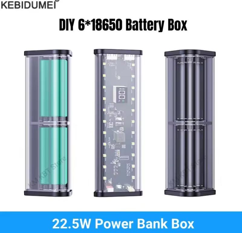 Предназначен для самостоятельной сборки (DIY) с использованием аккумуляторов 6шт. 18650. Поддерживает быструю зарядку PD 22.5W. Имеет прозрачный корпус, позволяющий видеть внутреннюю плату и компоненты. Оснащен светодиодным экраном и индикаторами для отображения уровня заряда и состояния.