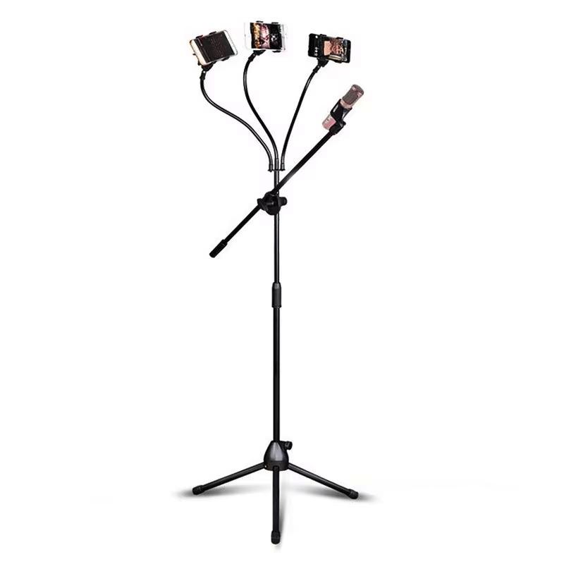 Стійка-тримач для мікрофона/телефона VHG NB-404 (Black) VHG NB-404 — багатофункціональна стійка-тримач, яка стане ідеальним рішенням для проведення караоке, онлайн-трансляцій, запису відео чи роботи на виставках. Її універсальний дизайн дозволяє одночасно закріпити до трьох смартфонів та мікрофон, забезпечуючи зручність та комфорт у будь-якій ситуації. * * * Модель: NB-404 Вага: 1,9 кг Висота: Регулюється від 80 до 190 см Колір: Чорний * * * ✅ Основні характеристики: • Регульована висота: Легко налаштовується для вашої зручності у діапазоні 80–190 см. • Тримачі для телефонів: Підходять для смартфонів шириною до 10 см, оснащені міцними пружинами для надійної фіксації. • Тримач для мікрофона: Універсальне кріплення для стандартних мікрофонів, що забезпечує стійкість та простоту використання. • Міцна основа: Тринога зі складними ніжками забезпечує стійкість навіть на нерівній поверхні. • Гнучкі кріплення: Легко регульовані гнучкі кронштейни для оптимального розташування телефонів чи мікрофона. * * * ✅ Зони використання: • Домашнє використання (караоке, блогінг, відеозйомка). • Громадські заходи (презентації, виставки, тренінги). • Студійна робота (запис подкастів, вокалу). * * * ✅ Особливості: • Матеріал: Метал та високоміцний ABS-пластик • Легкість транспортування: Компактно складається для зручного зберігання чи перенесення. • Універсальність: Сумісна з більшістю смартфонів та мікрофонів. * * * ✅ Комплектація: • Основна стійка • Тримачі для смартфонів (3 шт.) • Тримач для мікрофона (1 шт.) • Інструкція користувача * * * Стійка VHG NB-404 — це ідеальний вибір для тих, хто шукає універсальне та зручне рішення для запису, співу чи роботи з декількома пристроями одночасно.