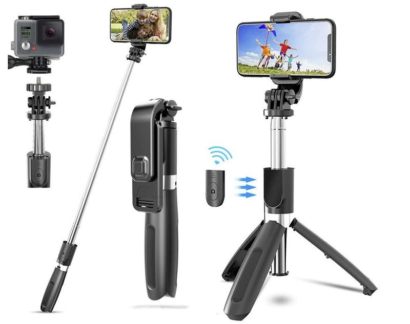 Селфи-палка трипод для телефонов, экшен камер, фотоаппаратов 4 в 1 с Bluetooth-пультом портативный штатив монопод тринога Beluck L02 Черный - это универсальный девайс который объединяет классический селфи-монопод с устойчивым триподом. Четыре режима: - ручной режим монопод - настольный режим штатив - режим высокого штатива - универсальный переходник для экшен камеры или фотоаппарата Длина в разложенном состоянии: 100 см. Длина в сложенном виде: 19 см. Универсальный аксессуар: - легко превращается в трипод-штатив для установки на столе; - выдвижная сэлфи-палка с вращающимся зажимом; - возможность установить любой смартфон с шириной экрана 60 - 100 мм; - Bluetooth-кнопка для управления процессом фотографирования (кнопка управления совместима со всеми устройствами, поддерживающими Bluetooth). Характеристики: - Совместимые версии системы: Android, iOS - Регулируемый угол наклона. - Компактная складывающаяся конструкция. - Съёмный пульт. - Универсальный переходник 1/4 дюйма для экшен камеры или фотоаппарата - Питание пульта от батареи CR1632 - Материал: ABS, металл - Вес: 196 г. - Размеры в коробке 4.5 х 19 х 4.5 см
