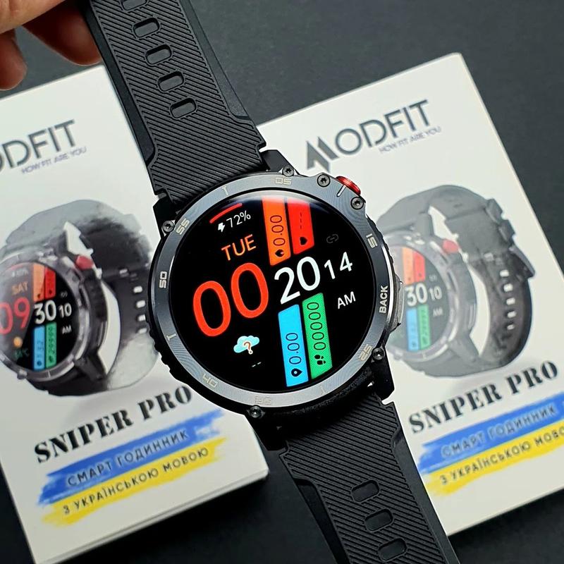 🔥Удароміцний та вологостійкий смарт годинник Modfit Sniper Pro. При купівлі годинника Тактичний ремінь та Ліхтарик у подарунок 🎁 Надійний смарт годинник з Українською мовою та водозахистом 5 АТМ🤿 Основною перевагою моделі є підвищена ударостійкість та водостійкість, а також потужна батарея, яка витримує до 1-2-х тижнів без підзарядки. ▫️Механізм: електронний ▫️Матеріал корпусу: поліуретан, сталь, каучук ▫️Діаметр корпусу: 50 мм ▫️Довжина ремінця: 25 см ▫️Оперативна пам'ять - 1 Gb ▫️ПЗУ - 4 Gb ▫️Підключення до IOS та Android ▫️ Акумулятор 400 mah. ▫️Функції: вимірювання пульсу, артеріальни тиск, крокомір, режим тренувань, фітнес трекер, пройдена дистанція відображається картою в додадку, розумний сон, підключення до будь-якого бренду телефону через офіційний додаток, режим нагадувань, дистанційне керування камерою, будильник, ультра-потужна батарея, що тримає 1-2 неділі, секундомір, будильник, управління плеєром, приймання дзвінків, читання повідомлень, вибір фонових заставок, пошук телефону, погода.