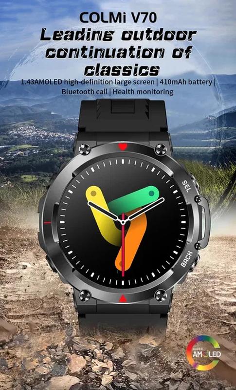 Специфікація COLMi V70 Розмір дисплея: великий 1,43-дюймовий Ultra HD AMOLED-дисплей, підтримує режими Always-on. Роздільна здатність дисплея: 466*466 пікселів, 391 PPI, яскравість до 1000 ніт Ємність акумулятора: 410 мАг Час автономної роботи: Режим економії заряду батареї: до 30 днів Типові режими використання: до 7 днів Рівень водонепроникності: IP68 Водонепроникний додаток: «Da Fit» Підходить для мобільних телефонів з Android 5.0 або вище або iOS 9.0 або вище. Функції Функції здоров'я: Монітор серцевого ритму 24/7, Датчик кисню в крові, Монітор сну, Дихання, Монітор стресу, Нагадування про пиття води, Нагадування про активність, Жіноче здоров'я, Підтримка здоров'я ******** Функції: Відповідь на дзвінок Bluetooth, Виклик з набором Bluetooth, Контактна особа, Записи дзвінків, Нагадування про повідомлення, Будильник, Таймер, Погода, Музичний пульт, Пульт дистанційного керування камерою, Знайти телефон, Калькулятор, Динамічний циферблат, Маркет циферблатів (200+ циферблатів), користувальницькі циферблати(Ви можете встановити картинку, яка вам подобається, як циферблат), Встановіть час вимкнення екрана, Режим «Не турбувати». Вбудований 4 інтерфейс користувача. Спортивні функції: відстеження активності протягом усього дня (кроки, калорії, відстань, мета), водонепроникність IP68, 100+ режимів вправ, звіт про спортивні дані. Мова Англійська, португальська, японська, корейська, німецька, французька, іспанська, арабська, російська, українська, італійська, китайська.