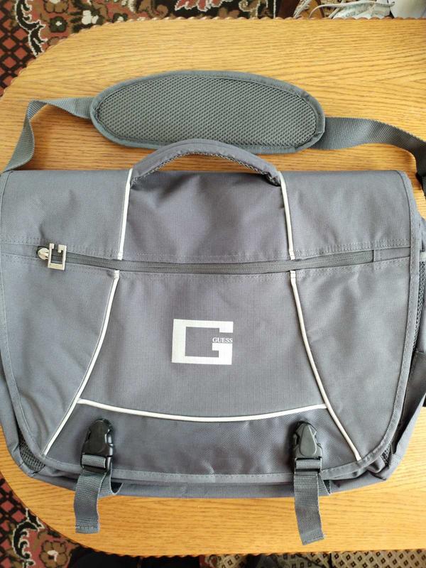 Изысканный портфель из новой коллекции Guess > водоотталкивающий материал >длина плечевого ремня 150см> ручка 17 серебристая светоотражающая фурнитура. Закрывается на лямки с защелками-фастек Внутри: - просторное основное отделение 46 х 8 см, подходящий для документов формата А4 - отделение для ноутбука с мягкой подкладкой - большое накладное отделение для документов на нем: - два кармана - сетка для бутилки 23 х 8 см - два накладных кармана 18 х 13 для записных карманчиков два кармашка для ручек