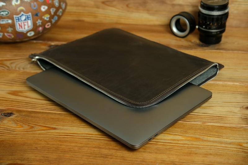 Чехол из натуральной (винтажной) кожи для macbook, закрывается на молнию, размеры для любо...