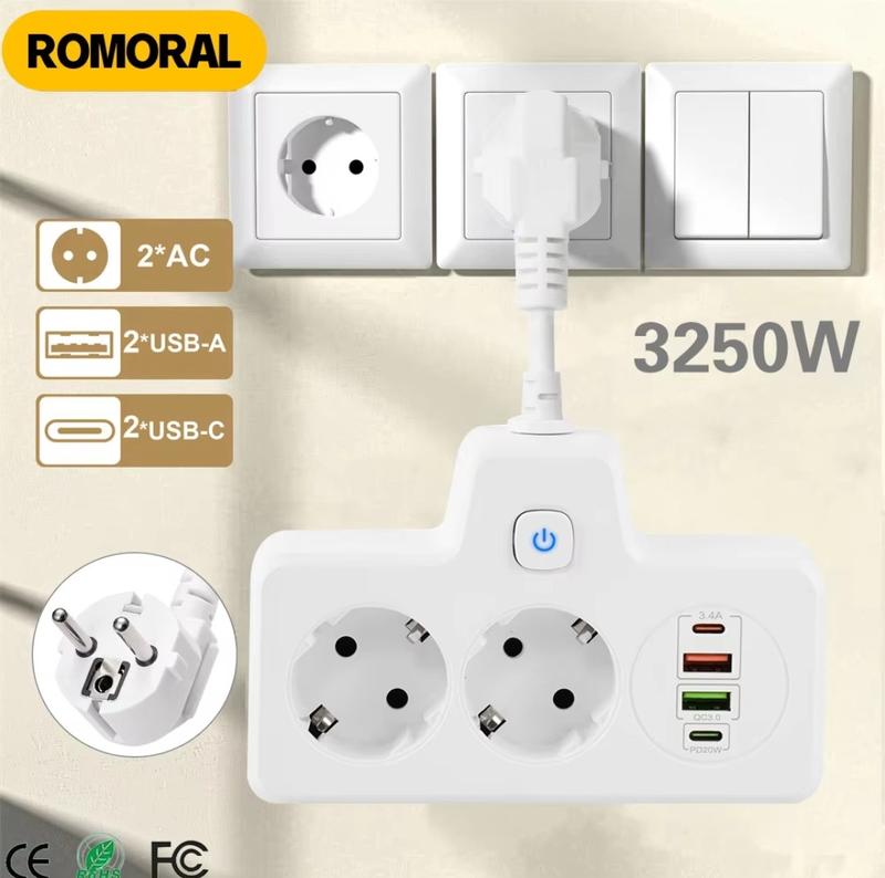 Компактный удлинитель с 2 сетевыми розетками 220В, оснащенными защитными шторками по технологии Child Security Door. 2 USB порта, 1 из которых имеет поддержку технологии быстрой зарядки Quick Charge 3.0, и 1 USB-C PD с поддержкой Apple - fast charging. Розетки и USB-выходы оснащены удобной кнопкой включения и выключения. С его помощью можно подключать не только электроприборы, но и одновременно заряжать до четырех мобильных устройств: смартфоны, планшеты, внешние батареи и многие другие устройства, поддерживающие зарядку от USB и USB-C PD. Контактные группы розеток изготовлены из высококачественного медного сплава. Корпус выполнен из жаропрочного пластика, способного выдержать температуру до 850 °C. Есть заземление и защита от перенапряжения. Короткий питающий кабель не путается, а его высокая прочность позволяет удлинителю висеть у стены в точке подключения.