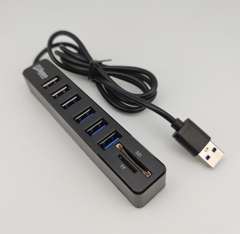USB-хаб COMBO на 6 портов (так же SD и TF карты), прочный пластиковый корпус обеспечит долгий срок службы, размеры: длина корпуса 12,20 см., ширина 2,40 см., высота 2,00 см., вес 59.00грм., длина кабеля 1 метр, цвет корпуса - черный.