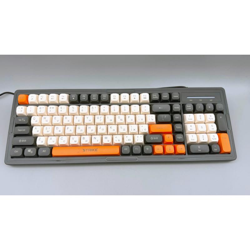Проводная клавиатура XSTRIKE X-1016 RGB USB с подсветкой Проводная клавиатура XSTRIKE X-1016 -- это надежное и практичное решение для дома, офиса и повседневной работы за компьютером. Модель имеет классическую полноразмерную раскладку с 105 клавишами, обеспечивая комфортный набор текста и удобный доступ ко всем функциям. Корпус изготовлен из прочного пластика, а удобный выступ под ладони снижает нагрузку при длительной работе. Яркая светодиодная подсветка делает клавиатуру удобной для использования в условиях недостаточного освещения. Подключение осуществляется через USB-интерфейс, усиленный кабель длиной 1,5 м обеспечивает стабильность и удобство размещения на рабочем столе. Особенности и преимущества: - Полноразмерная клавиатура с 105 клавишами. - Яркая LED-подсветка, удобная для работы в темноте. - Кнопка включения и выключения подсветки. - Классическая раскладка: украинская, английская, русская. - Усиленный USB-кабель длиной 1,5 м. - Совместимость с Windows, Vista, Mac OS. - Прочный пластиковый корпус. - Размер: 46 × 17,5 × 3,5 см. - Цвет подсветки: разноцветный (фиксированный режим, без переливания). Комплектация: - Клавиатура XSTRIKE X-1016 - Фирменная упаковка