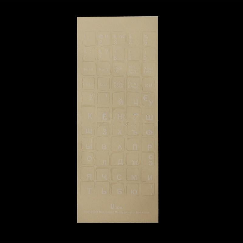 Практичная наклейка на клавиатуру, характеризующаяся простотой и удобством в использовании, предлагается покупателям по доступной цене. Неоспоримый плюс изделия состоит в том, что оно позволит преобразить любую понравившуюся хозяину клавиатуру, снабдив ее раскладкой на русском. Наклейка на клавиатуру имеет подложку желтого цвета и напечатана на самоклеящейся пленке из качественного винила. Символы на русском языке имеют белый цвет. Для придания изделию повышенной износостойкости производитель предусмотрел верхний ламинированный слой