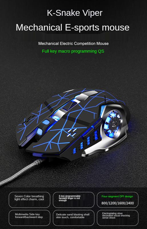 Бренд: K-Snake Тип: Проводная оптическая игровая мышь DPI (точек на дюйм): Регулируемая, обычно 1200/1600/2400/3200 DPI Подсветка: RGB или четырёхцветная светодиодная подсветка Кнопки: Обычно 4 или 6 кнопок Интерфейс: Подключение через USB