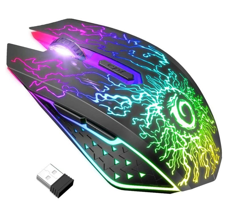 Перезаряжаемая беспроводная игровая мышь VersionTECH. с 7 индикаторами RGB, бесшумный щелчок, USB 2.4G, 3-уровневый DPI для компьютерных геймеров, ноутбуков, настольных компьютеров Chromebook Mac. Черная - Прочный и тихий щелчок: Беспроводная мышь проходит проверку на 5000000 нажатий клавиш, обеспечивая точную и длительную работу. Как левая, так и правая кнопки имеют бесшумный дизайн, бесшумные щелчки освобождают вас от беспокойства, чтобы не мешать другим, и позволяют сосредоточиться на игре и работе. - Перезаряжаемая беспроводная мышь: Встроенная аккумуляторная батарея и кабель для зарядки, замена батарей не требуется. Кроме того, мышь оснащена передовой интеллектуальной технологией энергосбережения, мышь автоматически переходит в спящий режим после 8 минут бездействия. Просто нажмите любую кнопку, чтобы повторно активировать его - 7-цветный свет RGB: Уникальный молниеносный дизайн в сочетании с дышащим 7-цветным светодиодным светом, несколько цветов меняются автоматически, подчеркивая атмосферу игры, особенно ночью. Вы можете отключить свет кнопкой ниже, если оно вам не нужно. - 3-уровневый DPI для игр и работы:Просто нажмите кнопку DPI, чтобы изменить скорость движения мыши, 8************ Трехуровневый DPI соответствует потребностям работы и большинству игр. Кроме того, 6 кнопок включают слева, вправо, вперед, назад, DPI и колесо прокрутки, чтобы сделать вашу работу более эффективной. - Стабильное беспроводное соединение 2.4G:Разработанная технология беспроводного соединения 2.4G обеспечивает плавную передачу сигнала без задержек на расстоянии до 10 м, хорошо совместима с настольным компьютером Chromebook и системами Windows 10, 8, 7, Vista, Mac OS / Linus и другими системами.