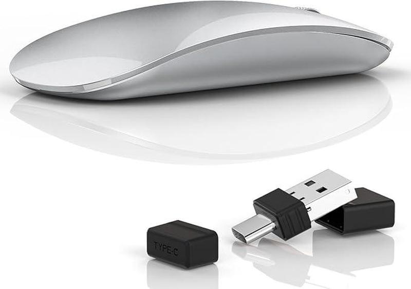 Беспроводная мышь Uiosmuph G11 2.4 ГГц с USB-приемником Ультратонкая бесшумная мышь с регулировкой 1000-1200-1600 DPI, для ноутбука, ПК, планшета (серебристая) Эта мышь подключается к беспроводной технологии 2.4 ГГц са с помощью USB- наноприемника. Дальность передачи данных может достигать 10 метров. Легко подключается и используется, не требует драйверов. Индикатор заряда батареи: Видимый индикатор заряда батареи в нижней части мыши позволяет узнать уровень заряда батареи и вовремя подзарядить мышь. Попрощайтесь с беспокойством по поводу заряда батареи. (Индикатор светится только при использовании). Ультратонкий и удобный дизайн: Беспроводная мышь легкая и компактная. Идеально подходит для путешествий, легко помещается в сумку для ноутбука и не занимает много места. Перезаряжается и регулируемая мышь DPI】3 переключателя DPI (1000/1200/1600) свободно меняют скорость мыши. Встроенный аккумулятор, который легко заряжается с помощью кабеля USB-C, входящего в комплект. Мышь для ноутбука автоматически переходит в спящий режим после 8 минут бездействия. Просто нажмите любую кнопку, чтобы активировать мышь. Широкая совместимость: Данная USB-мышь совместима практически со всеми компьютерами с USB портом и операционными системами Windows XP, Windows 7, Windows 8, Windows 10 и Mac OS. Бесшумная беспроводная мышь: Специальный бесшумный дизайн правой и левой кнопок, чтобы не мешать другим. Симметричный дизайн позволяет использовать ее для обеих рук.