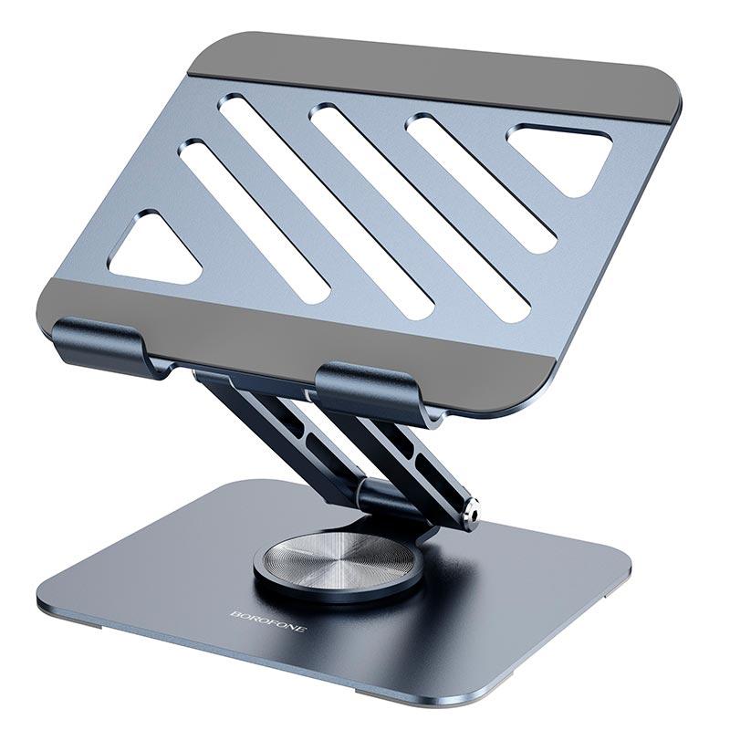 Подставка для ноутбука Borofone Vito BH115 Подставка позволит удобнее разместить ноутбук для работы. BH115 Vito – функциональная подставка для планшета или ноутбука, которая сделает ваше взаимодействие с гаджетом более комфортным и производительным. Аксессуар улучшит охлаждение устройства, поможет установить удобный угол наклона клавиатуры и станет настоящим украшением рабочего места благодаря оригинальному дизайну. Переписывайтесь в чатах, играйте в любимые игры и работайте с профессиональным софтом, расположив клавиатуру планшета или ноутбука наиболее удобно для себя. Регулируемая подставка с вращающейся на 360° базой поддерживает разные уровни подъема лэптопа, поэтому каждый сможет настроить аксессуар под себя, избежав дискомфорта во время длительного времяпровождения за ноутбуком. Портативная и легкая: эту подставку весом всего 221 г и размером 147×127×37 мм можно носить с собой, брать в путешествия и командировки, а складная конструкция обеспечивает еще более удобное и эргономичное хранение и транспортировку этого аксессуара. Прочная и долговечная изготовлена из высококачественного алюминиевого сплава, эта подставка создана, чтобы служить вам долго и выдерживать ежедневное использование. Мягкие силиконовые накладки на поверхности и ножках предотвращают скольжение девайса и подставки. Универсальная совместимость: эта подставка совместима с широким спектром устройств диагональю 12,9 дюймов. Материал: Алюминиевый сплав + силикон