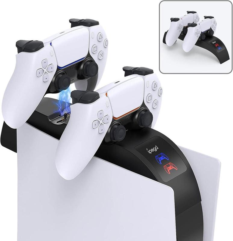 Описание - Уникальный дизайн --- Эта зарядная станция для контроллера PS5 специально разработана для PS5. Она не только идеально подходит к верхней части консоли PS5, не влияя на ее теплоотдачу, но также может быть размещена отдельно на рабочем столе или в тумбе под телевизором для хранения контроллера и экономии места. - Быстрая зарядка 2,5 часа --- Док-станция для зарядки контроллеров может быстро заряжать два контроллера для PS5 одновременно, полная зарядка занимает всего 2,5 часа. Оснащен 3,3-футовым USB-кабелем для передачи данных, нужно только занять консоль для порта USB PS5, или вы можете подключить внешний адаптер питания 5 В/2 А для зарядки контроллера, чтобы освободить консоль для порта USB PS5, не влияя на производительность. - Интеллектуальная защита -- зарядная станция для контроллера прекратит зарядку контроллера для PS5, когда он полностью зарядится, и обеспечит защиту от перегрузки по току, перенапряжения, перегрева и короткого замыкания во время зарядки, что позволит вам заряжать устройство более безопасно и надежно. - 2 индикатора зарядки -- индикатор зарядки облегчает зарядку контроллера: когда зарядная станция находится в режиме ожидания или контроллер полностью заряжен, горит синий индикатор; когда контроллер заряжается, горит красный индикатор. - Простая установка/снятие --- Двусторонняя лента внизу может сделать зарядную базу более устойчивой для установки наверху для консоли PS5. И двустороннюю ленту можно использовать повторно. Когда вы разбираете ее и устанавливаете снова, просто протрите пыль влажной тканью.