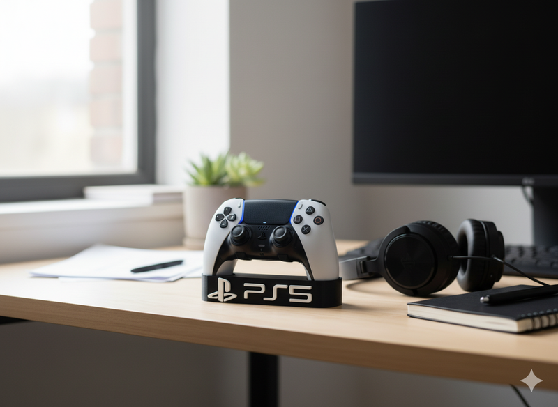 Стильная настольная подставка, специально разработанная для вашего контроллера DualSense, идеально подходит для демонстрации и аккуратного хранения геймпада. Она превратит ваш контроллер в настоящий элемент декора. Данное изделие выполнено по современной технологии 3D-печати, что обеспечивает высокое качество и детализацию. Обратите внимание, что оттенок изделия может отличаться от изображения на фото из-за особенностей филамента и процесса печати. Ключевые особенности: Фирменный дизайн: Подставка выполнена в черном цвете с контрастным белым логотипом PS5 и символом PlayStation, подчеркивающим принадлежность к экосистеме консоли. Идеальная совместимость: Разработана для обеспечения устойчивого и безопасного хранения контроллера DualSense. Организация пространства: Помогает поддерживать порядок на игровом столе, обеспечивая легкий доступ к геймпаду. Эстетический вид: чёткие линии и фирменная брендировка делают эту подставку обязательной аксессуаром для каждого владельца PS5.
