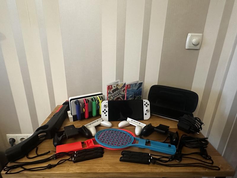 - Nintendo Switch OLED + хаб + блок живлення + HDMI - Швидкісна SD карта на 512 гб (можна встановити дуже багато ігри з маркету) - 4 додаткові джойстики Joy-Con - 2 двійні тримачи для джойстиків - 2 одинарних тримача для джойстиків - 2 тенісних ракетки для джойстиків - 1 дробовик для джойстиків - 2 кріплення джойстиків на ноги - Хаб зарядка на 4 джойстиків Joy-Can - 6 заглушки на джойстики Joy-Con - Кейс для переносу приставки - Картридж гри - Super Mario Party - Картридж гри - The Legend of Zelda: Breath of the Wild - Накладки на стіки джойстиків Стан ідеальний. Продається тільки все разом, ваш досвід буде неймовірний😌