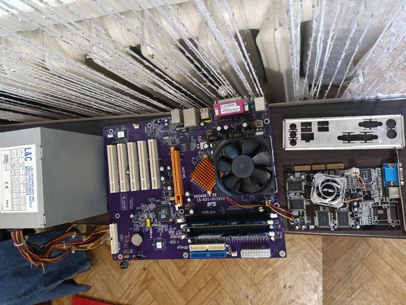 Комплект на 462 сокеті материнская плата - Elite Group N2U400-A с задней планкой процеессор - АМД sempron 2200+ с кулером память – 2 планки: 512Мб +256 Мб видеокарта - inno mx(440) se tv ddr 64 agp блок питания – 250Вт Включил, затвор, в биос заходит. Больше не тестировал. В целом для любителей повозится с историей.