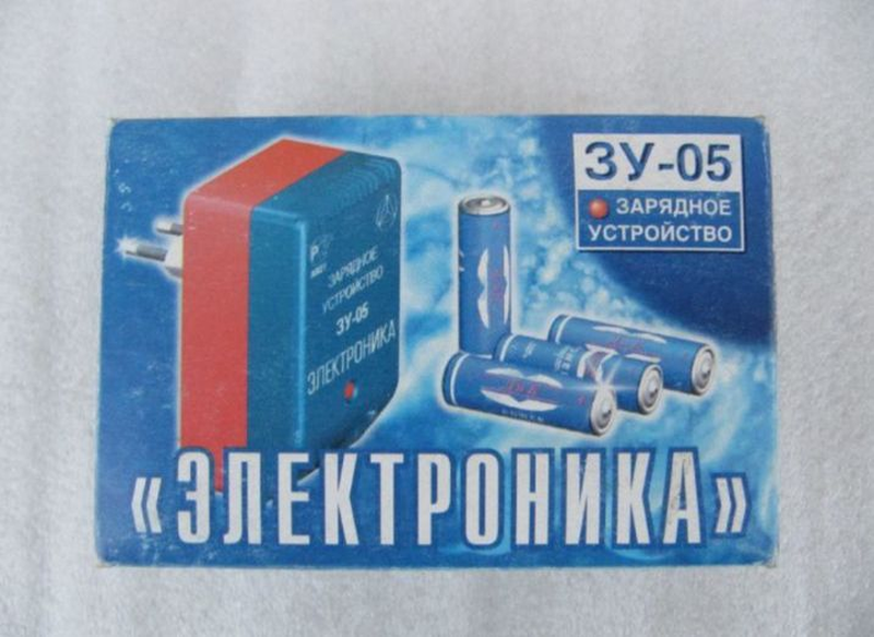 Зарядний пристрій "ЕЛЕКТРОНІКА ЗУ-05" (Ставрополь), нове, 2003 року випуску, для акумуляторів АА, з зарядним струмом 130 мА. Призначений для заряду 4-х акумуляторів типу АА (НКГЦ-0,45 і НКГЦ-0,5). Є світлодіодна індикація процесу зарядки. Пристрій має поворотну вилку 220В, яка підходить для евророзеток і прозору захисну кришку для зарядного відсіку. В комплекті фірмова коробка, пристрій, паспорт.