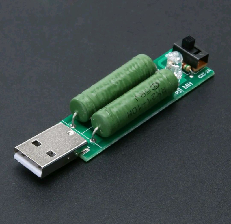 Кілька примірників у наявності Опис USB навантаження з перемикачем 1 А/2А може використовуватися для тестування адаптерів живлення різних пристроїв: телефонів, смартфонів, планшетів, повербанків, акумуляторних батарей тощо. Складається з двох резисторів із опором 5,1 Ом, штекера USB типу A, двоколірного світлодіода, перемикача. Характеристики: - опір забезпечує навантаження: 1 або 2 ампери; - напруга живлення: 5 В; - номінальна потужність: 5 або 10 Вт; - тип резисторів: постійні керамічні; - розміри: 74 х 17 х 10 мм; - вага: 14 г.
