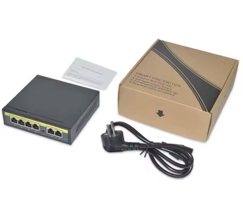 POE коммутатор 48V 100Mbs Блок питания встроенный в корпус: 52V 1,25А = 65Вт, шнур питания в комплекте. 2 порта Uplink (без POE) для подключения например роутера + видеорегистратора 4 порта POE для подключения POE устройств с питанием. PoE-контроллер может автоматически определить и обеспечить питание всех устройств IEEE 802.3af/at (PD). Поддерживает питание по кабелю Cat.5 Ethernet беспроводных точек доступа, сетевых камер видеонаблюдения и IP-телефонов Коммутатор неуправляемый, никаких настроек нет (принцип Plug&Play - включил и все работает) Мощность каждого PoE порта до 15.4Вт (af) или 30Вт (at) Обычная Ip Камера потребляет в среднем 5вт днем / 8вт ночью. Хороший запас мощности, хватает как для поворотных камер, так и для камер с усиленной ночной подсветкой. Габариты: 205x140x45мм
