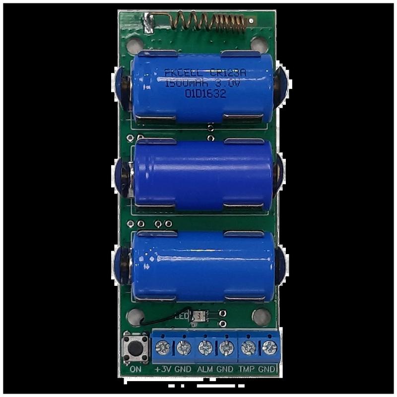 2 входа для подключения отдельных проводных датчиков. 1 вход тампера. выход для питания датчиков 3В, 50 мА. Три батареи CR123A