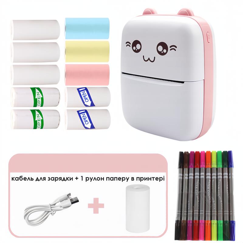 Мини принтер bluetooth детский термопринтер блютуз принтер для телефона принтер фотографий Невероятный маленький принтер Mini Printer поможет вашему ребенку почувствовать себя совсем взрослым, а также лучше запомнить буквы, цифры, новые слова, в игровой форме. На нём можно печатать раскраски, прописи, буквы, цифры, любимых персонажей, фотографии и многое другое, что сможет отвлечь вашего ребенка либо помочь в развивающих занятиях. Для более взрослых пользователей, это незаменимый помощник, который позволит записать, передать сообщение, снять снимок, скриншоты. На данном принтере можно печатать любую текстовую или графическую информацию прямо с вашего смартфона через bluetooth соединение. Благодаря своим компактным размерам, блютуз принтер всегда можно положить в карман куртки или небольшую сумку. Никаких проводов, вся работа с мобильным принтером происходит при помощи Bluetooth 4.0 и вашего смартфона. Не стоит беспокоиться, что в нужный момент в карманном принтере закончатся чернила, так как печать происходит без их помощи, а методом нагрева термобумаги. Особенности устройства: - Термопечать без использования краски - Прямая печать со смартфона через фирменное приложение FunPrint - Портативный и автономный мобильный принтер с встроенным аккумулятором 1000 мАч - Быстрое прямое соединение с вашим смартфоном по bluetooth каналу через фирменное приложение. - Просмотр содержимого перед печатью на экране вашего телефона. - Сохранение истории всей распечатанной информации. Технические характеристики: - Тип: карманный принтер, портативный bluetooth принтер - Тип печати: Термопечать. - Цвет печати: Черно-белая - Ширина печати: 53 мм - Расходные материалы: рулонная термобумага. - Размер бумаги: ширина 57мм. - Способ подключения: по Bluetooth. - Поддерживаемые смартфоны: Android, IOS. - Питание: встроенный аккумулятор 1000 мАч. - Размер: 113x 80 x 38мм. Комплектация: - Портативный термопринтер - 1 шт - Рулонная термобумага белая - 4 шт (1 в принтере + 3 дополнительно) - Рулонная термобумага белая самоклеющаяся - 2 шт - Рулонная термобумага цветная - 3 шт (желтая - 1 шт, голубая - 1 шт, розовая - 1 шт) - Рулонная термобумага белая (печатает синим цветом) - 2 шт - USB кабель для зарядки - 1 шт - Двухсторонние фломастеры набор 10 шт - Инструкция
