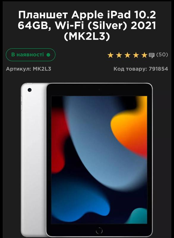 Apple iPad 10.2 64GB, Wi-Fi (Silver) 2021 (MK2L3), не включается, отали в ремонт сказали сломался процессор, все остальное работает