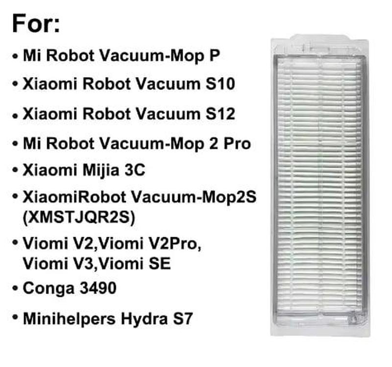 HEPA фильтр - (размер 150х50 мм, с прозрачной рамкой): Эти фильтры имеют высокую степень фильтрации, которая позволяет улавливать мелкие пылевые частицы и аллергены. Они обеспечивают чистый воздух в вашем доме и помогают бороться с аллергическими реакциями. HEPA фильтр совместим с широким спектром моделей роботов-пылесосов Xiaomi, включая: -Xiaomi Mi Robot Vacuum-Mop P -Xiaomi Mi Robot Vacuum-Mop 2 Pro -Xiaomi Mijia LDS Laser Navigation Robot Vacuum Cleaner -Xiaomi Robot Vacuum S10/ S12 -Xiaomi Mi Robot Vacuum-Mop 2S -XMSTJQR2S -Viomi V2 -Viomi V2Pro -Viomi V3 -Viomi SE - Cecotec Conga 3290 - Cecotec Conga 3390 - Cecotec Conga 3490 - Cecotec Conga 3590 - Cecotec Conga 3690 - Cecotec Conga 3790 - Cecotec Conga 3890 Ultra - Cecotec Conga 3890 Vital - Cecotec Conga 3890 titanio - Minihelpers Hydra S7 (Model : STYTJ02YM / STYJ02YM / V-RVCLM21B / SKV4110GL / BHR5771EU) И многие другие модели.