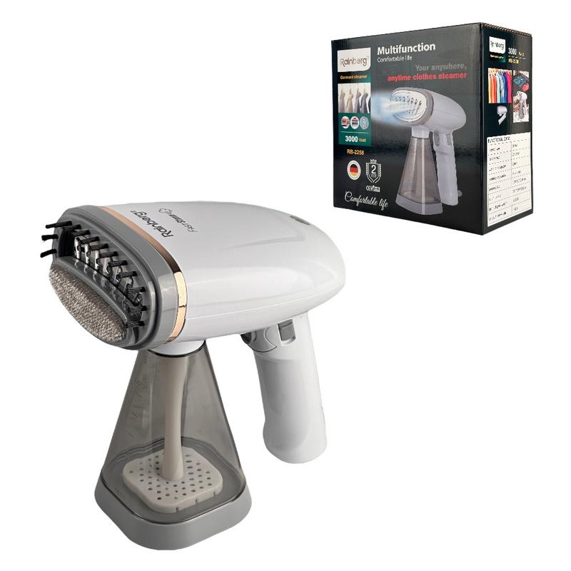 Відпарювач ручний Rainberg. Потужність - 3000 Вт. Потік пару - 30 мл/хв. Розмір - 19х11,5х20 см. Об'єм резервуара - 240 мл. Живлення – мережа, 220 В. Управління – механічне. Матеріал – пластик, нержавіюча сталь. 2 насадки в комплекті. Готовність до роботи - 45 секунд. Температура пару - 98 ° C. Упаковка – коробка.
