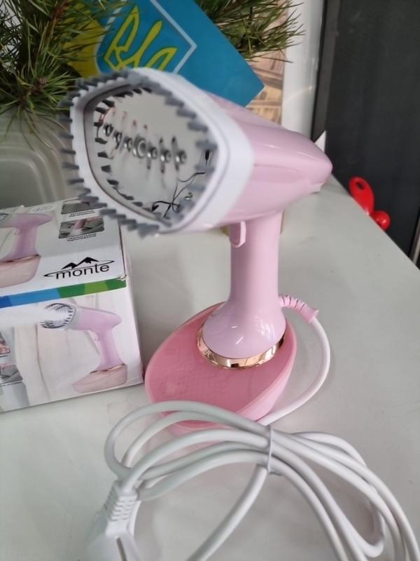 Ручной отпариватель для одежды Monte MT-1575. Мощность: 1850 Вт. Объем резервуара для воды: 400 мл. Производительность пара: 25 г/мин. Особенности: вертикальное и горизонтальное отпаривание, быстрый нагрев, длинный шнур, щетка.