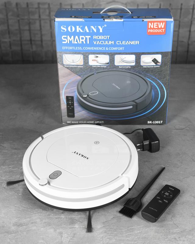 Робот-пылесос Sokany SK-13017 - ваш незаменимый помощник в ежедневной уборке. Благодаря компактным размерам и высоте всего 6 см, это устройство легко проникает в труднодоступные места, гарантируя качественную очистку. Оснащенный двумя боковыми щетками и салфеткой из микрофибры, он эффективно удаляет пыль, песок и шерсть животных с твердых поверхностей и ковровых покрытий. Этот пылесос имеет 4 режима уборки, что позволяет выбрать оптимальный вариант в зависимости от ваших потребностей. Управление роботом очень простое: пульт дистанционного управления позволяет удобно настраивать работу пылесоса, а на корпусе есть кнопка включения/выключения для мгновенного старта. Sokany SK-13017 оснащен мощным аккумулятором, обеспечивающим до 80 минут непрерывной работы, что позволяет эффективно убрать помещение площадью 90-120 кв.м. Зарядка устройства осуществляется с помощью блока питания, который входит в комплект. Основные преимущества: Компактные размеры: Легко достигает труднодоступных мест. Четыре режима уборки: Четыре режима уборки: Гибкость при выборе оптимального способа очистки. Длительное время работы: Аккумулятор обеспечивает до 80 минут непрерывной работы для больших площадей. Характеристики: * Управление: пульт ДУ * Количество режимов уборки: 4 * Емкость аккумулятора: 1500 ма*ч * Время работы на одном заряде: 80 мин * Час зарядки: 5 годин * Вес: 1.9 кг * Размеры: 32.5*32.5*8 см * Гарантийный срок: 3 мес * Насадки: 2 боковые щетки, салфетка из микрофибры * Мощность: 2000 Вт * Режимы уборки: Точечный (spot), автоматический, случайный, ручной * Комплектация: Робот-пылесос, Пульт ДУ, 2 боковые щетки, Блок для зарядки, Инструкция