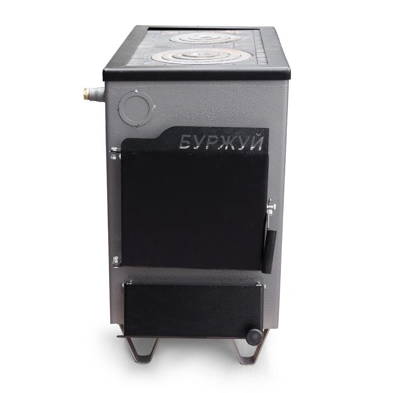 Буржуй КП-18 кВт твердопаливний котел з плитою, з виходом димоходу назад, виготовлений з високоякісної сталі товщиною 4 мм. Працює на всіх видах твердого палива: дрова, вугілля, тирса, брикети, обрізки гілок.Переваги: Тривалість горіння палива на одному завантаженні до 8 годин (в залежності від спалюваного виду палива). Чавунні колосники запорука довгої служби котла. Котел можна використовувати як плиту в котел вбудована чавунна плита з конфорками для приготування їжі. На плиті є кілька кілець під посуд різного розміру. Універсальність підключення котел має чотири патрубки для установки в систему опалення, що дозволяє підключити його як з лівого, так і з правого боку. Незадіяні виходи закриваються заглушками, які йдуть в комплекті. У комплекті: круглий вихід димоходу 150 мм або 170 мм, або прямокутний розміром 100х200 мм. У верхній і нижній частинах камери згорання встановлені два наповнених водою теплообмінника, дно також обладнано водяною сорочкою. При нагріванні досягається оптимальне співвідношення потужності котла до об'єму води в ньому. Це дозволяє отримати максимум тепла від палаючого палива і запобігає закипанню води, збільшуючи термін служби виробу. Теплообмінники виконані з цілісного листа сталі, без додаткових зварних швів. Можливість установки електричного ТЕНу до котла можна підключити електричний ТЕН і автоматику. ТЕН підтримує безперервну роботу котла в разі відсутності твердого палива, дозволяє утримувати температуру води в системі на рівні 5-10 С. Котел також працює як батарея котел може віддавати тепло від поверхні стінок. Розміри топки (ВхШхГ), мм 300х300х67.