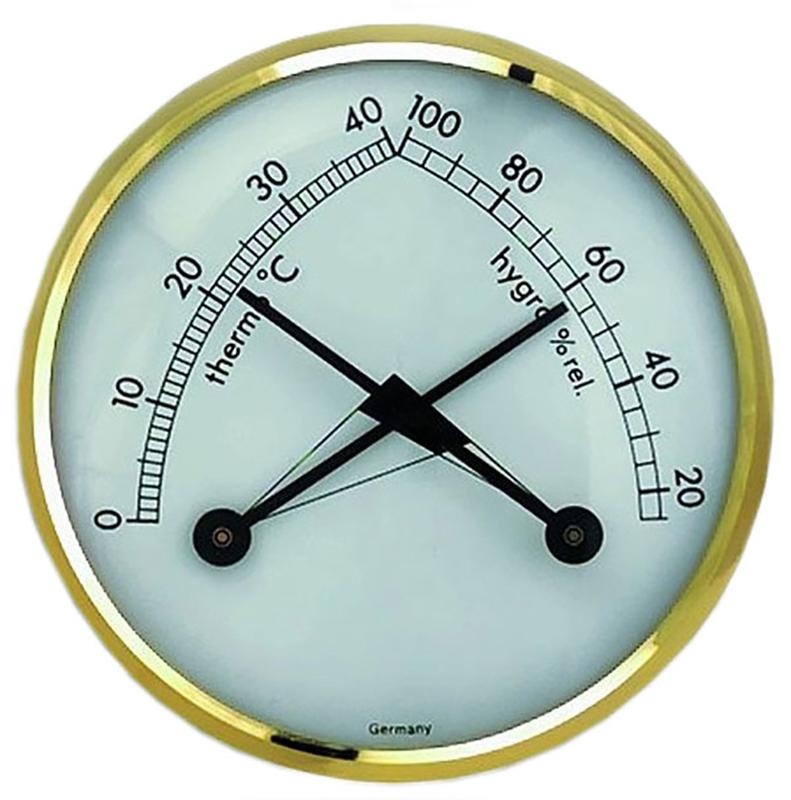 - Назначение: измерение температуры и относительной влажности воздуха - Тип: механический - Установка: на стену Измерение температуры воздуха: - Единицы измерения температуры: градусы по Цельсию - Диапазон измерения температуры: от 0°С до +40°С - Точность: ± 1 °C Измерение относительной влажности воздуха - Диапазон измерения: от 15% до 100% - Точность: ± 1 % - Диаметр устройства: 7.1 см - Вес: 35 г - Цвет: золотистый