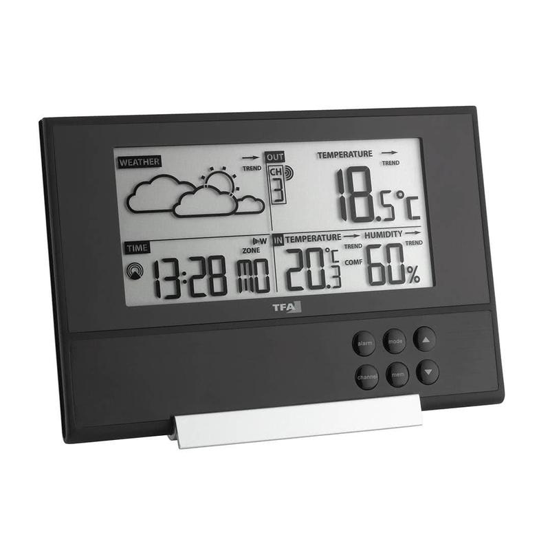 Метеостанция TFA (351107) PURE – это беспроводная многофункциональная погодная станция. Метеостанция TFA PURE выполнена в тонком черном корпусе и имеет жк дисплей, разделенный на 4 секции. Погодная станция TFA PURE отображает прогноз погоды на ближайшие 12 – 24 часа, текущее время, температуру воздуха внутри и снаружи помещения, влажность в помещении. TFA PURE комплектуется одним дистанционным датчиком термометром. Для контроля температуры в других помещениях к метеостанции Pure возможно подключить одновременно 3 внешних датчика. ⠀ Дисплей в метеостанции TFA PURE легко читаем, разбит на 4 секции. Секция 1 WEATHER: прогноз погоды с символами и тенденцией атмосферного давления. Секция 2 OUT: наружная температура с символом приема данных, номер канала. Секция 3 IN: символ батарейки внешнего датчика, внутренняя температура и влажность с индикатором уровня комфорта. Секция 4 TIME: радио контролируемое время с секундами / днем недели или датой, иконка батарейки метеостанции и символ будильника. ⠀ Характеристика TFA PURE: прогноз погоды, внешняя температура воздуха, внутренняя температура и влажность воздуха, уровень комфорта, стрелочная тенденция (возможно увидеть, растет ли атмосферное давление, температура и влажность в настоящее время, падает или не изменяется), время, будильник, календарь, контроль зарядки батареек, беспроводной датчик термометр (30.3127) - в комплект TFA PURE входит дистанционный датчик термометр, который устанавливается на улице или в другом помещении на расстоянии не более 40 метров от основного блока TFA PURE. Датчик измеряет температуру и передает данные по радиочастоте 433 МГц). ⠀ Комплектация TFA PURE: 1. Основное устройство TFA PURE (35.1107). 2. Датчик термометр TFA (30.3127). 4. Батарейки 2 шт. AА 1,5 В и 2 шт. CR2032. 5. Инструкция. 6. Гарантийный талон. ⠀ Гарантия: 12 месяцев. ⠀ Метеостанция TFA (351107) PURE – это замечательный прибор для дома или офиса.
