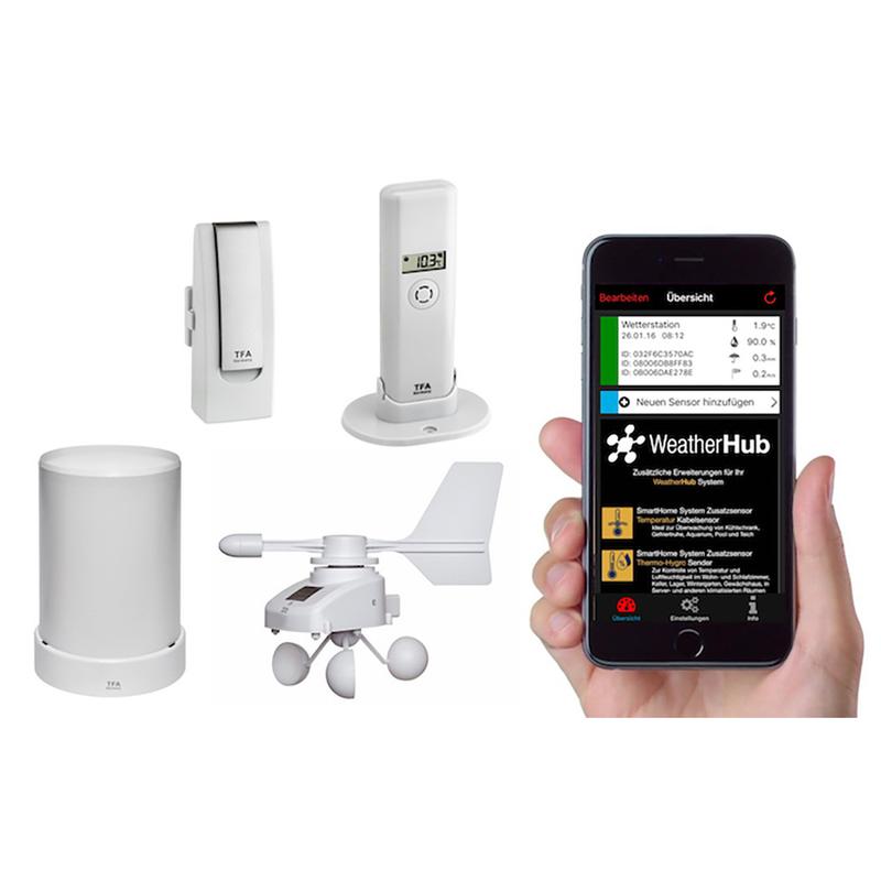 Контролюйте за допомогою технології WeatherHub от TFA клімат у приміщенні та на вулиці в віддаленому режимі в будь-який час і в будь-якому місці. Метеостанція TFA WeatherHub 31400502 з бездротовими датчиками, за допомогою смартфона дає змогу перевіряти такі дані, як: вимірювання температури/вологості повітря, кількості опадів, а також швидкості та напрямку вітру (з сонячною панеллю). - Вимірювання температури/вологості повітря, кількості опадів, а також швидкості та напрямку вітру. Особливості: - Віддалене спостереження кімнатних і зовнішніх кліматичних умов у будь-який час у будь-якому місці - Просте налаштування сигналізатора обмежень - Push-охоплення, якщо перевищуються сигнальні ліміти - Показання зберігаються за останні 90 днів - Розширення до 50 зовнішніх бездротових датчиків - Дані можуть бути зображені також іншими користувачами - Графічний огляд даних - Функція максимальних мінімальних значень - Експорт даних (CSV файл) Датчик температури/вологості повітря: - Діапазон вимірювання температури: -40°C... +60°C - Діапазон вимірювання вологості: 0... 99% - Дальність передавання даних: до 200 метрів (відкритий простір) - Частота передавання даних: 868 МГц - Габарити (ВхШхГ): 12,9(13,5)х4,1(8,3) x3,5(6,1 см) - Вага: 0,042 кг - Живлення: 2x1,5 В AAA батарейки (не постачаються в комплекті) Датчик рівня опадів: - Загальна кількість опадів, кількість дощовитих днів, середня кількість опадів - Діапазон вимірювання: 0...300 мм - Дальність передавання даних: до 100 метрів (відкритий простір) - Частота передавання даних: 868 МГц - Габарити: Ø 13,2x18,4 см - Вага: 0,31 кг - Живлення: 2x1,5 В AA батарейки (не постачаються в комплекті) Датчик швидкості та напрямку вітру: - Напрямок і швидкість вітру, пориви вітру, максимальна швидкість вітру - Діапазон вимірювання швидкості вітру: 0...180 км/год (0...50 м/с) - Одиниці виміру швидкості вітру: км/год, м/с - Роздільна здатність вимірювання швидкості вітру: 0,1 м/с - Точність вимірювання швидкості вітру: +/-1 м/с <8 м/с, +/-10%> 8 м/с - Діапазон вимірювання напрямку вітру: 16 позицій - Роздільна здатність: 22,5° - Дальність передавання даних: до 100 метрів (відкритий простір) - Частота передавання даних: 868 МГц - Габарити (ВхШхГ): 19,5х25х15 см - Вага: 0,233 кг - Живлення: Сонячна панель із вбудованою акумуляторною батареєю. (2xмікро LR03 AAA лужні) Сумісність: - iOS 7.0 або Android 3.2 (або новіша версія) Комплектація: - Інтернет-шлюз 31.4000.02 - Бездротовий датчик температури/вологості 30.3303.02 - Бездротовий датчик рівня опадів 30.3306.02 - Бездротовий датчик швидкості та напрямку вітру 30.3307.02 - Блок живлення 230 В~ 50 Гц - Мережевий кабель (RJ45) - Монтажні аксесуари Країна-виробник: Китай