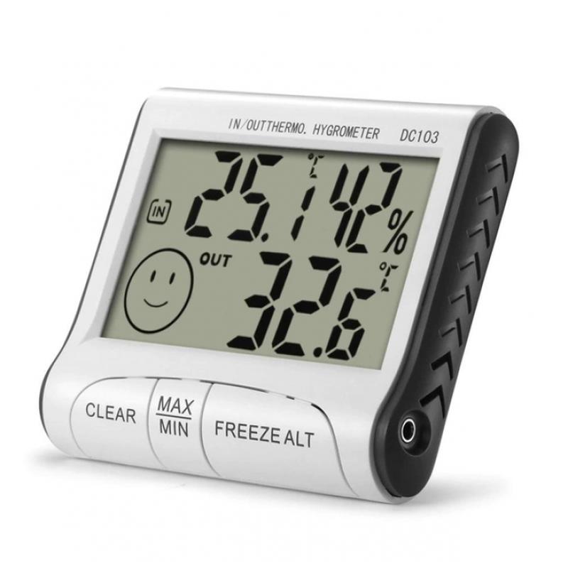 Термометр - гигрометр DC103 -- это универсальный цифровой измеритель влажности воздуха в помещении плюс двухзонный термометр с выносным датчиком температуры. Прибор выполнен в качественном корпусе из ABS пластика с удобной ножкой- подставкой и магнитом для крепления на металлических предметах. Для простого считывания показаний устройство имеет ЖК-дисплей размером 62х37 мм с большими цифрами. На лицевой стороне расположены три кнопки управления. Также он поддерживает два типа единиц измерения °C и °F, имеет функцию памяти максимального и минимального значения температуры. Кроме температуры и влажности в помещении, прибором можно измерять температуру воздуха на улице с помощью идущего в комплекте выносного датчика температуры длинной 1 метр. Работает DC-103 от одной Батарейка AG13. Поставляется в блистерной упаковке. Характеристики: 1. Измерения температуры в помещении: от -10°C до + 50°C (±1°C); 2. Измерения температуры на улице: от -50°C до + 90°C (±1°C); 3. Диапазон измерения влажности: 10% ~ 99% (±1%); 4. Длина кабеля датчика наружной температуры: 1 м; 5. Дисплей: LCD 2,9" 6. Питание: 1 батарейка AG13 таблетка; 7. Размеры: 80 мм х 70 мм х 20 мм. 8. Вес прибора: 61 гр. Особенности: - Наличие памяти минимальной и максимальной температуры; - Измерение температуры и влажности воздуха в помещении + температура на улице; - Магнит для крепления на металлических поверхностях; - Анимационный смайлик; - Современный дизайн; - Выбор единиц измерения температуры °C/°F Комплектация: 1. Термометр - гигрометр DC-103; 2. Наружный датчик; 3. Батарейка AG13 (маленькая таблетка) ; 4. Инструкция на английском; 5. Блистерная упаковка.