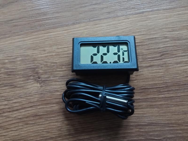 Термометр для измерения температуры в помещении или на улице, в холодильниках, морозильниках, в аквариуме и др. Оснащен выносным датчиком. Характеристики: Диапазон: от -50 до 110 °C. Питание - LR44 (1,5V) 2 шт. (не входит в комплект) Длина провода 1 метр. Габариты: 47,8 x 28,5 x 14,3 мм.