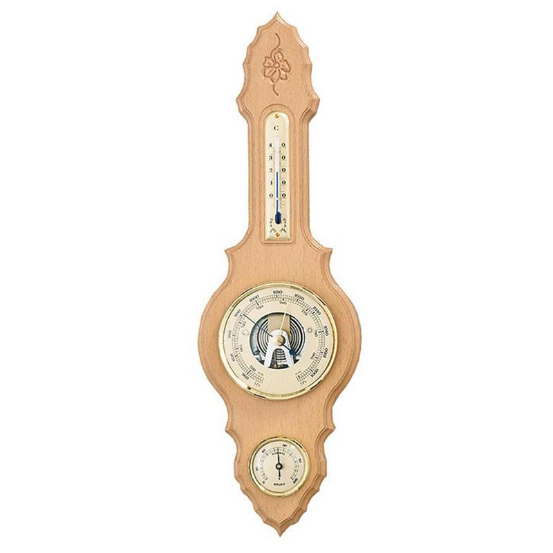 Настенная метеостанция Moller 203026 Beech состоит из барометра с большим открытым циферблатом, гигрометра и термометра, объединенных в деревянном корпусе. Вся продукция Moller производится из твердых пород дерева, а именно из бука, поверхность шлифуется, после чего корпус покрывается специальными составами лака для придания необходимой долговечности, цвета и текстуры древесины бука. Барометры Moller адаптированы для нашего рынка и имеют шкалу не только в гектопасках, но и в миллиметрах ртутного столба. Качество и надежность продукции Moller подкреплены пятилетней гарантией. Moller Therm GMbH является семейной компанией в третьем поколении, которая вот уже более 50 лет специализируется на производстве аналоговых интерьерных барьеров, гигрометров и термометров, предназначенных для домашнего использования. Даже во времена всемирной глобализации все производство компании до сих пор находится исключительно в Германии, в поселке Кройцвертгайм (Бавария). По современным меркам компанию можно назвать крафтовым производителем, который изготавливает свою продукцию из натурального дерева исключительно под заказ. Таким образом производитель может проконтролировать качество своей продукции и без опасения предоставить гарантию сроком 5 лет на свои изделия. Функции: Прогноз погоди: - Прогноз погоды на 8-12 часов (циферблат отображает погоду, которая по прогнозу настроится через 8-12 часов) - Прогноз погоды определяется по направлению движения стрелки барометра относительно маркерной стрелки Атмосферное давление - Единицы измерения: мм. рт. ст., или гПа (Милиметры ртутного столба / Гектопаскали). - Диапазон измерения атмосферного давления: от 714 мм. рт. ст. до 801 мм. рт. ст. (от 952 гПа до 1068 гПа). - Дискретность измерения: 1 мм. рт. ст. (1 гПа) - Точность измерения: +/- 5 мм. рт. ст. (+/- 5 гПа) - Отображение тенденции атмосферного давления (Отклонение стрелки влево от маркера - давление падает / Отклонение стрелки вправо от маркера - давление возрастает) - Возможность калибровки Температура в помещении: - Единицы измерения: oС - Диапазон измерения: от -3°C до +47°C - Дискретность измерения: 1°C - Точность измерения: +/- 1C° Влажность в помещении: - Единицы измерения: % RH - Диапазон измерения: от 0% до 100% - Дискретность измерения: 5% - Точность измерения: +/-5% - Возможность калибровки Характеристики и комплектация: Циферблат: - Размер циферблата барометра: 90x90 мм; - Размер циферблата гигрометра: 47x47 мм; - Цвет цифеблата: под золото; - Цвет оправы циферблата: под золото; Особенности конструкции: - Материал корпуса: натуральное дерево (бук) - Большой открытый циферблат барометра открывает для обзора сам механизм - Установка: на стене - Цвет корпуса: Beech (бук) Комплектация: - Метеостанция - Инструкция на украинском языке Размеры и вес: - Размеры метеостанции без упаковки, мм: 390х123х38 - Размеры в упаковке, мм: 425х125х50 - Вес метеостанции без упаковки, кг: 0.370 - Вес в упаковке, кг: 0.465 Срок гарантии: 5 лет Производитель: Moller (Germany)