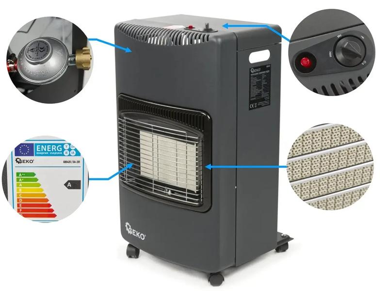 Опис Газовий обігрівач з редуктором та шлангом G80435 Geko Характеристика Цей газовий обігрівач постачається з регулятором та шлангом . Пристрій може похвалитися високою тепловою потужністю 4,2 кВт . Він живиться від газового балона з пропаном/бутаном об'ємом 11 кг . Він ідеально підходить для обігріву приміщень середнього розміру. Обігрівач оснащений термоелектричним запобіжним пристроєм , який негайно відключає подачу газу, якщо горіння переривається. Він має триступеневе регулювання потужності нагріву та п'єзоелектричний запальник. Він оснащений колесами, що дозволяють легко переміщувати обігрівач, незалежно від того, чи встановлено балон, чи ні. - потужність нагріву 4,2 кВт - керамічний нагрівальний елемент - піч, що працює від стандартного балона з пропаном/бутаном вагою 11 кг - можливість постачання менших циліндрів, потрібен спеціальний адаптер - панель керування, оснащена п'єзорозпалювачем та перемикачем для зміни потужності нагріву печі - термоелектричний захист - піч має поворотні колеса, що дозволяє легко її переміщувати - редуктор і шланг у комплекті - максимальне споживання газу становить 305 г/год Технічні дані - Модель DA-201 - Тип газу: пропан/бутан - Категорія пристрою I3 B/P - Тиск подачі газу 37 мбар - Споживання газу макс. 305 г/год - Теплова потужність 1,5 / 2,8 / 4,2 кВт - П'єзоелектричне запалювання - Редуктор тиску типу 571F відповідно до EN 16129 - Вхідний тиск 0,3 - 16 бар - Тиск на виході редуктора 37 мбар - Продуктивність редуктора 1,5 кг/год - Робоча температура від -20°C до +50°C - Вхідний роз'єм G1, G2, G4, G5, G7, G8, G10, G11, G12, G13 - Роз'єм розетки H1, H4, H50, H51, H53