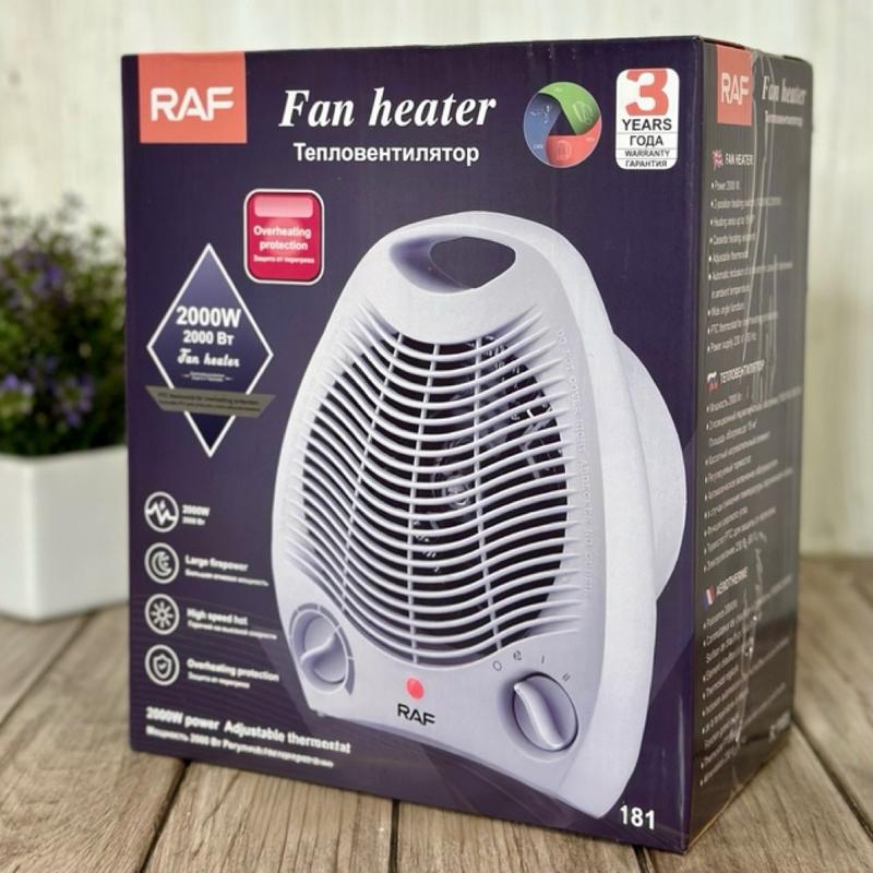 ТЕХНІЧНІ ХАРАКТЕРИСТИКИ: ТепловентиляторRAF R.1181 Тип - кімнатний обігрівач Площа обігріву - до 22 кв.м Потужність - 2000 Вт Нагрівач - спіральний трубчастий електронагрівач Напруга - 220-240В Керування - механічне Корпус не повертається Колір Білий Особливості корпус виготовлений з термостійкого пластика, світловий індикатор роботи, ручка для переміщення, аварійне вимкнення при падінні, термостат, запобіжник від перегріву, 3 режими роботи Розмір: 235 * 135 * 275 мм Виробник - Китай Опис: Тепловентилятор (дуйчик) RAF R.1181 Дуже компактний, легкий і простий у використанні, здатний обігрівати ванну кімнату, невелике офісне приміщення і незамінний помічник на дачі, завдяки впровадженню нових технологій збільшує пропускну здатність корисного об'єму повітря, що в свою чергу сприяє швидкому обігріву приміщення (при дотриманні правил експлуатації)
