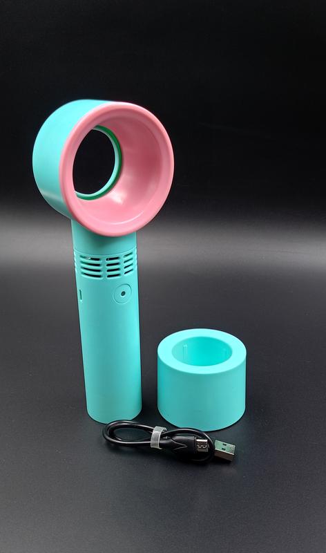 Беспроводной мини вентилятор с подставкой. Имеет три режима работы. Высота 19 см без подставки и 21 см на подставке. Ширина 6 см. В комплекте есть зарядное устройство. Стан идеален. Материал пластик. Легкий и комфортный в использовании, станет неотъемлемым помощником летом во время жары, а также во время путешествий.