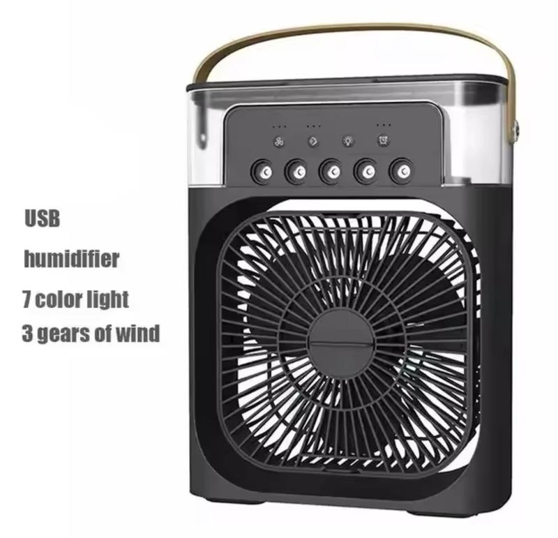 Міні кондиціонер Air Cooler Fan 4в1 Зволожувач з LED підсвічуванням нічник USB Матеріал: ABS пластик; Тип керування: кнопкове; Місткість резервуару для води: 600 мл; Потужність: 10 W; Кількість швидкостей: 3; Розмір: 21*26*9 см; Вага: 670 г; Регульована швидкість - 3 швидкості охолодження (висока, середня, низька). Можна регулювати вручну вгору-вниз, напрямок обдування в межах 60