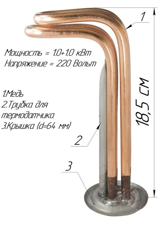 Двойной ТЭН изогнутой формы с медной оболочкой, с клеммами и трубкой под термодатчик, крышка нержавейка (d=62) с гидроизоляцией, P= 1000+1000 Вт, V= 220 В