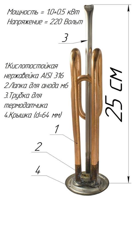 Двойной ТЭН изогнутой формы с медной/нержавеющей оболочкой, с клеммами и трубкой под термодатчик, крышка нержавейка (d=64) с гидроизоляцией, P=1000+500 Вт, V=220 В Оболочка - Медь Клеммы и крепление для анода Крышка- d=64мм