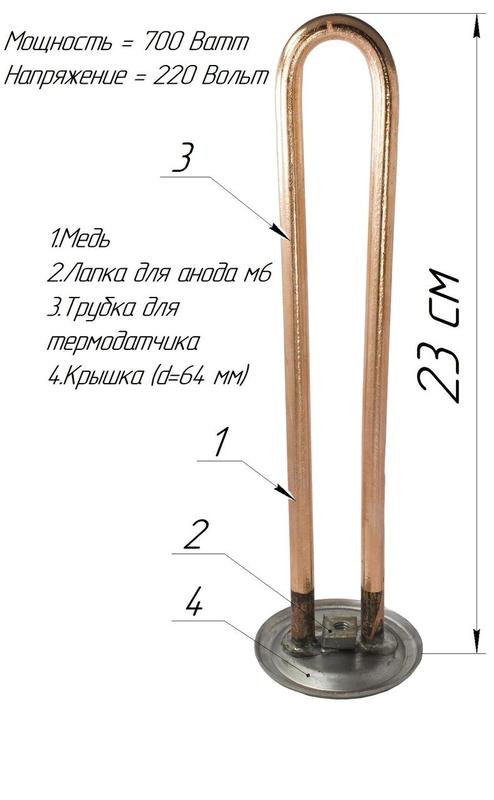 Прямой ТЭН с медной оболочкой, с клеммами и местом для крепления для анода, крышка (d=62) нержавейка/латунь с гидроизоляцией , P= 700 Вт , V= 220 В