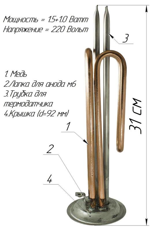 Двойной ТЭН с медной, контакт с М4, место для анода и две трубками под термодатчики, крышка нержавейка (d=92) с гидроизоляцией, P= 1500+1000 Вт, V= 220 В, Тэрмо ( d=9 ) 310 и 310 мм