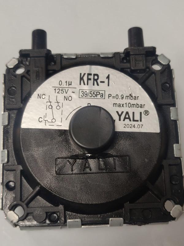 Прессостат - контролирует работу вентилятора котла - будучи соединенным с ним при помощи  силиконовых патрубков. После запуска котла, включается вентилятор; образовавшийся поток и давление газов смещают мембрану в прессостате, которая замыкает контакты. Плата управления отмечает это и запускает розжиг и контроль пламени. Все это делает прессостат важнейшим узлом системы безопасности котла - если мембрана не будет замкнута, плата управления сделает вывод что вентилятор неисправен, а значит безопасная работа котла невозможна. Конструктивно он представляет собой простой пластиково-металлический корпус квадратной формы с чувствительной мембраной внутри. На корпусе установлен микропереключатель с тремя контактами. Устройство имеет давление срабатывания в 0,9 mbar. Максимальное давление - 10 mbar. Эти значения широко распространены, и это делает данный прессостат очень универсальным устройством, использующемся в широком ряду котлов и колонок, произведенных в Китае, Турции и Европе.